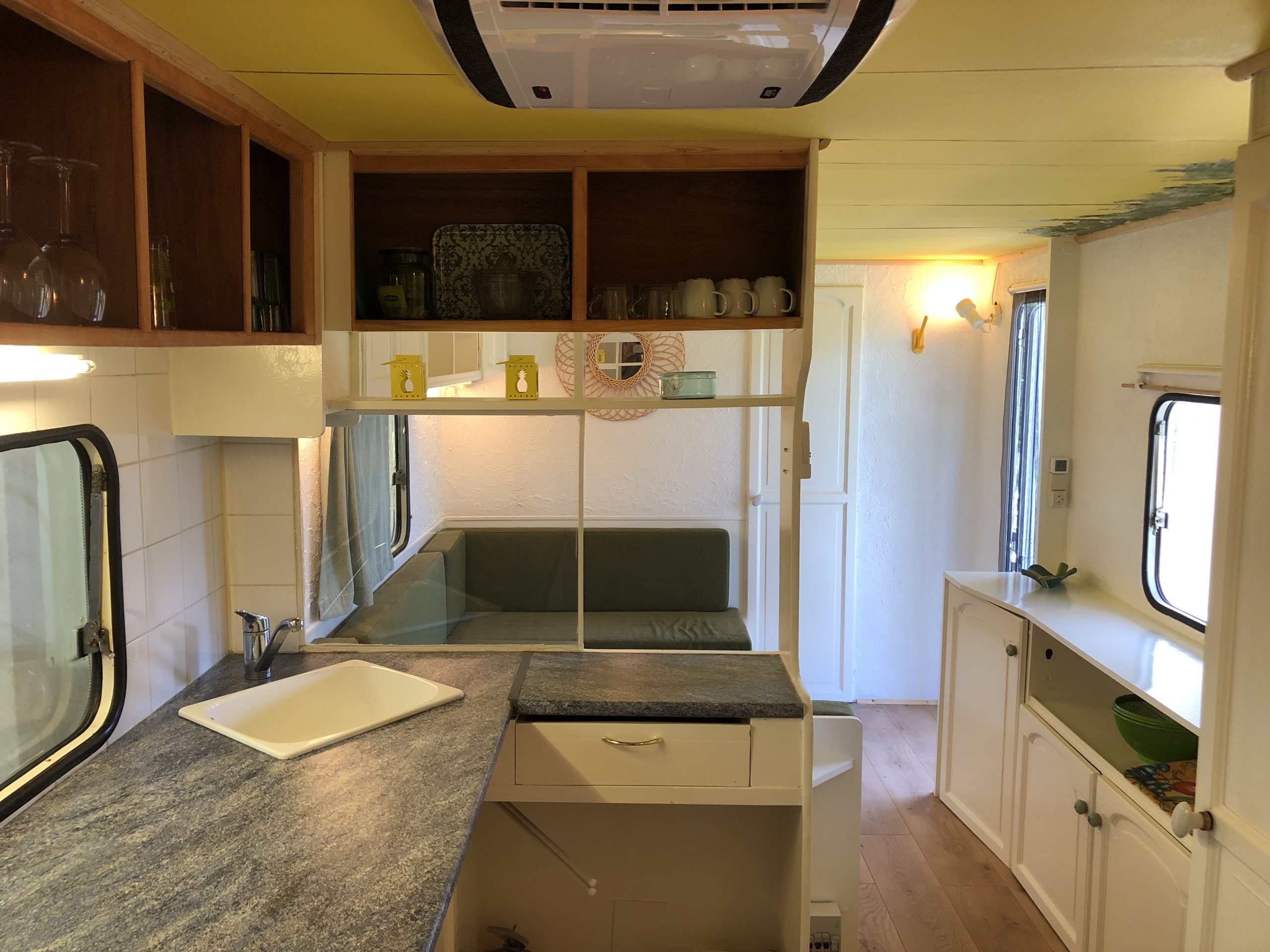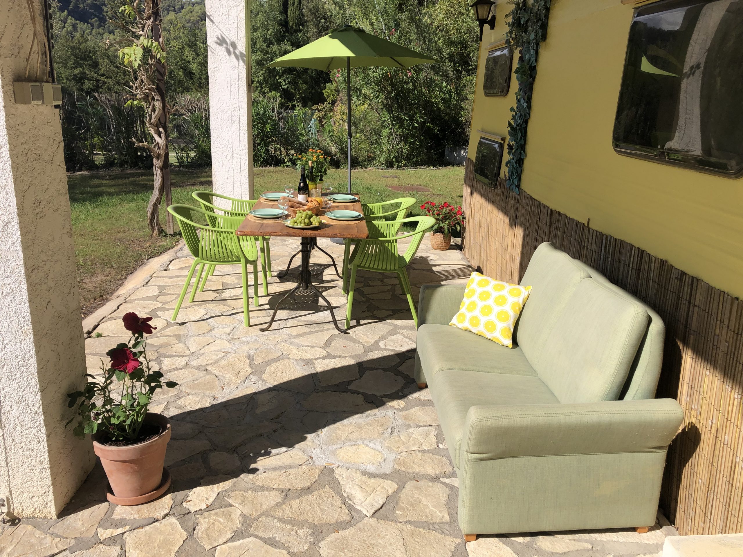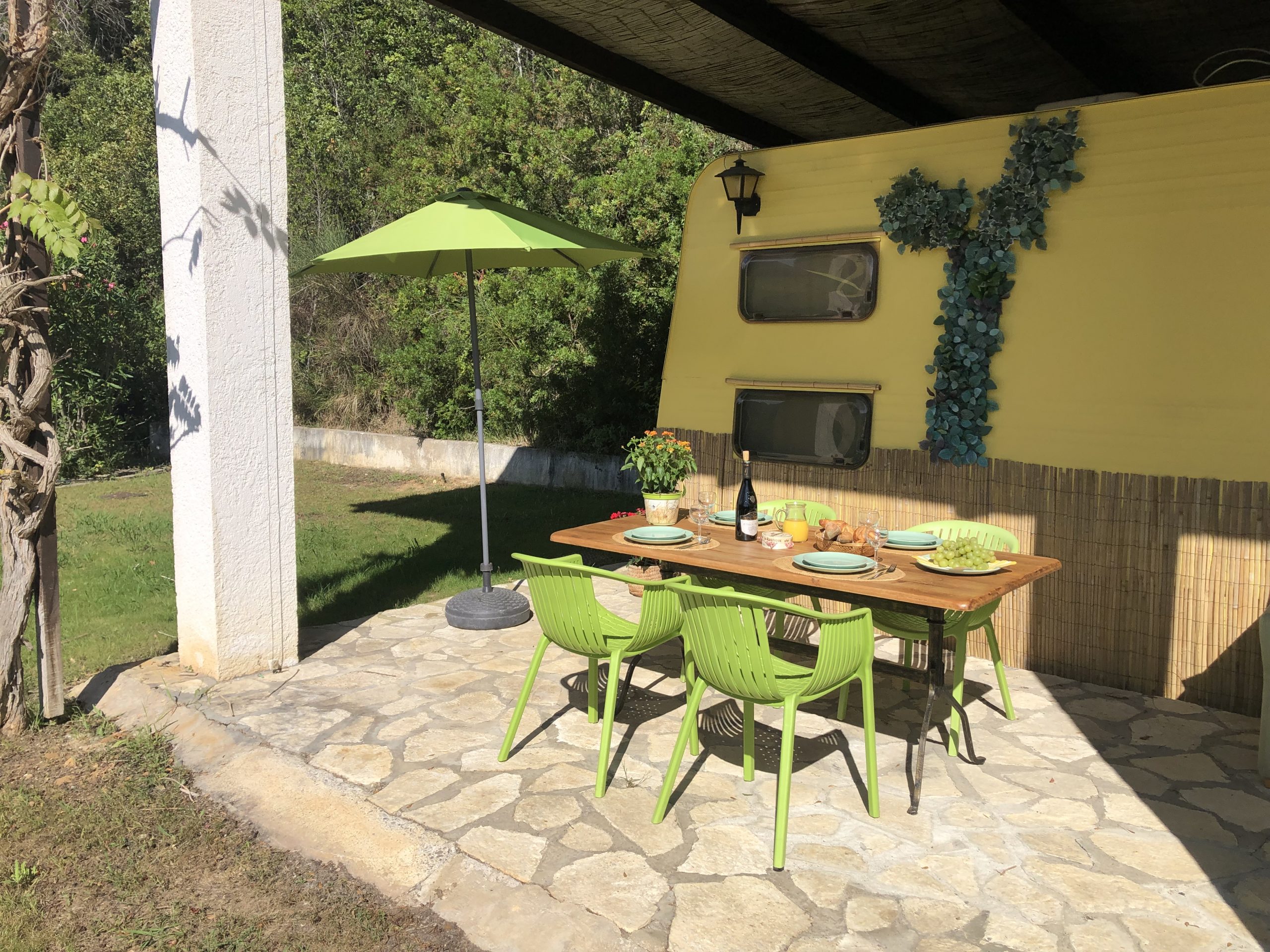 Located on the crest of the domain you’ll find our 10 meter long caravan. It has a covered terrace where you can relax, sit in the sun and have diner.