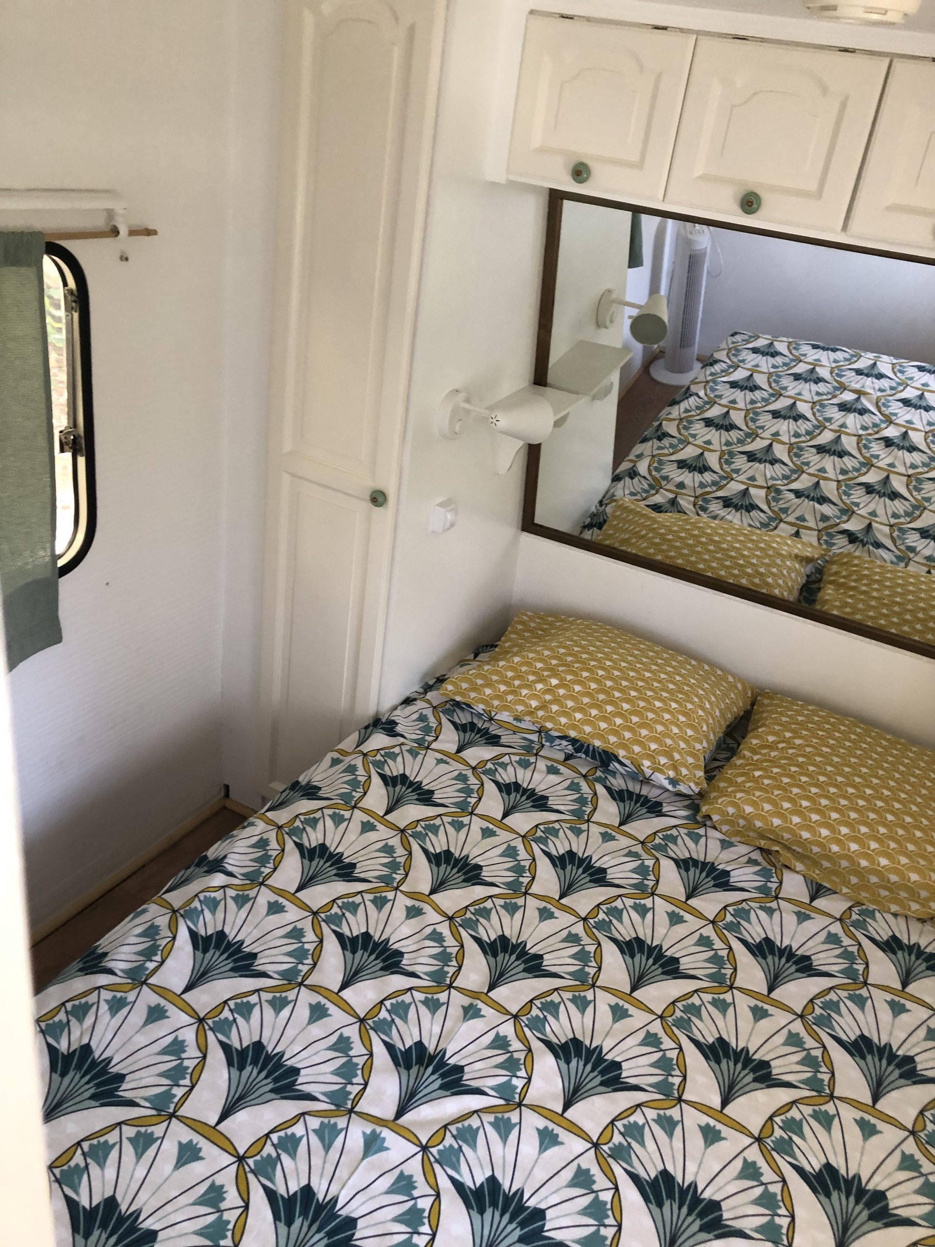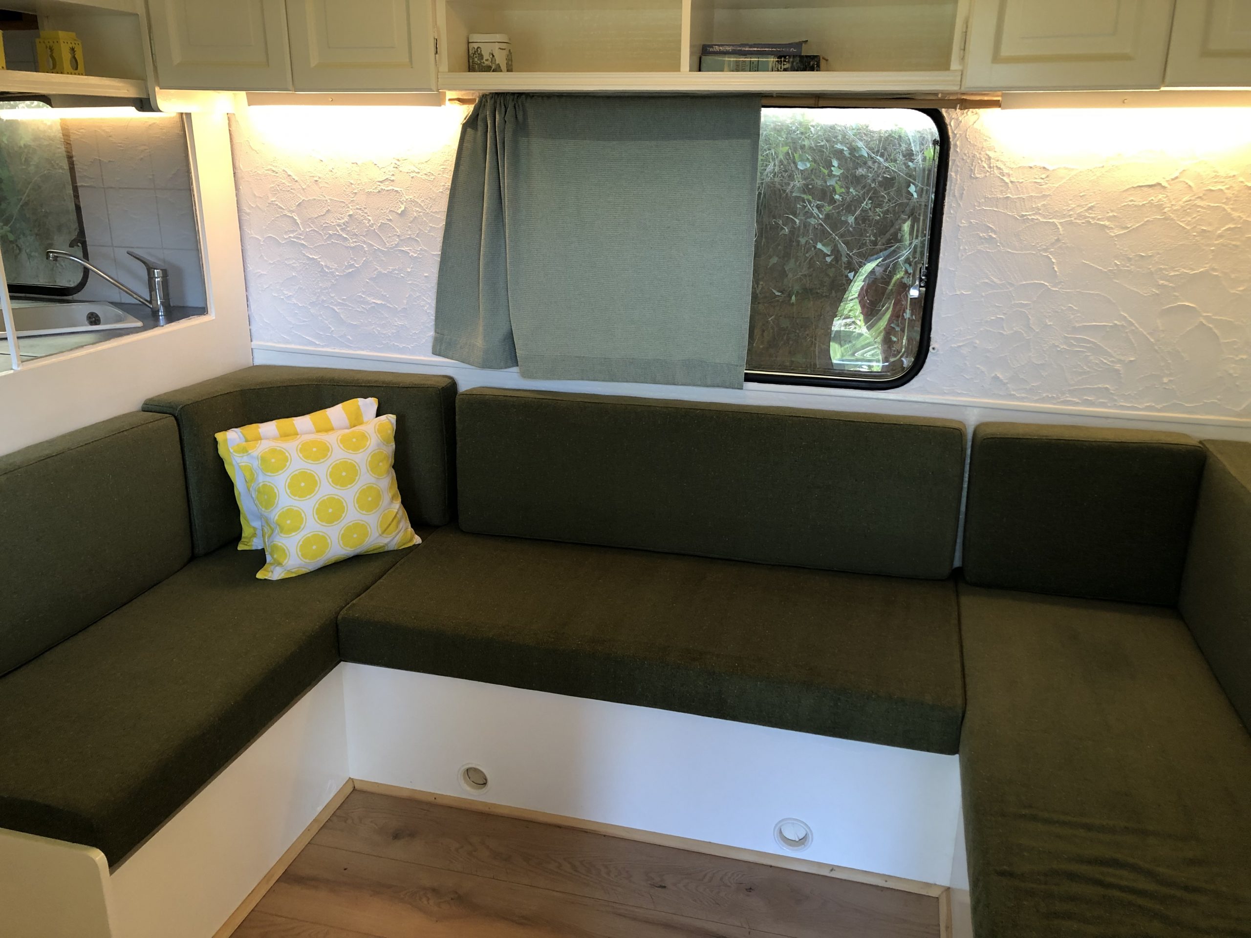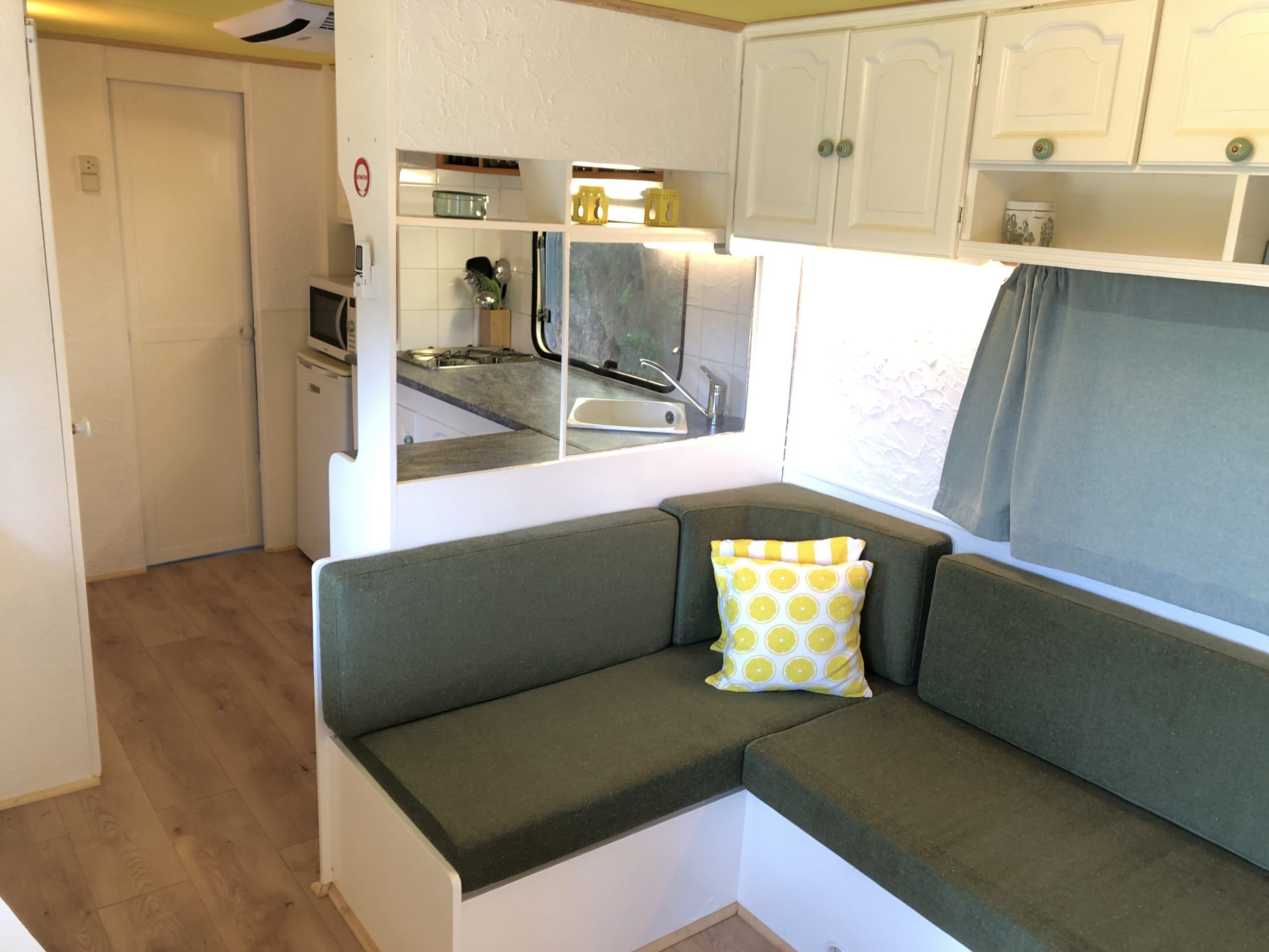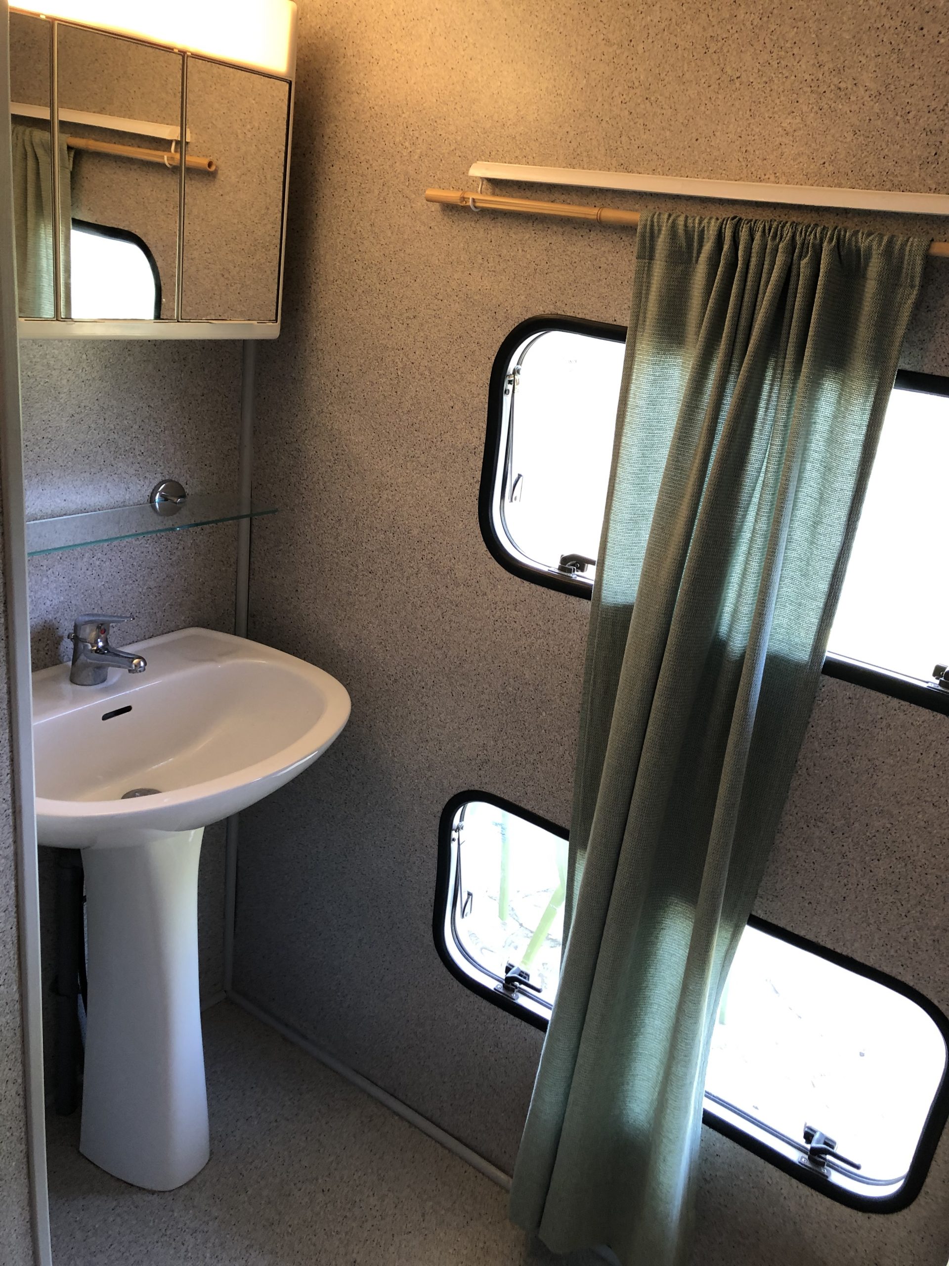 Located on the crest of the domain you’ll find our 10 meter long caravan. It has a covered terrace where you can relax, sit in the sun and have diner.
